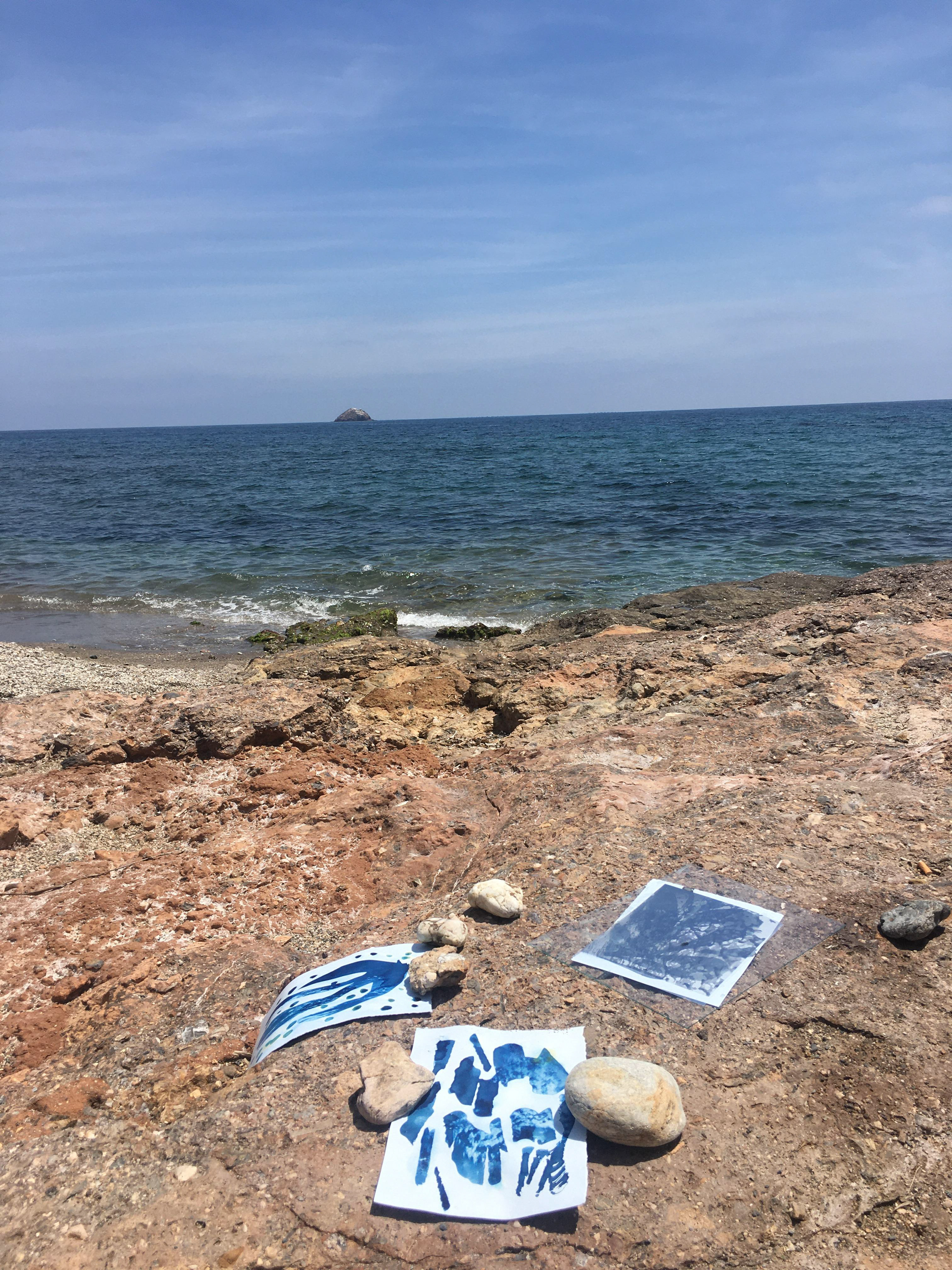 The area was dry, rocky and desertlike. I had never been in such a place before. I was enchanted by the surrounding mountains, being close by the sea and living in such bare landscape. I become fascinated by trying to capture this place, document it, try and understand what it made me feel. I did this through drawing, writing, lino and cyanotype printing.